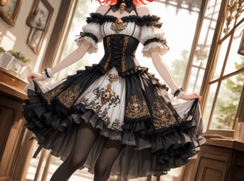 ちょっと実験的要素も含めたプロンプトです。モトはノースリーブのオフショルドレスで、全面に髑髏のデザインとこーなんてゆーんだ?あ、そうそう、シャンデリア柄をあしらったイメージ。 ただ髑髏を強くするとシャンデリア柄が押されたり、タイツやネックの描画がなくなったりとアイテム関連でちょっとん-?みたいな感じです。また、モデルによってはまるきり異なるよーなデザインで出てしまうことも。 gothic lolita dress, victorian gothic fashion, black and white two ...
