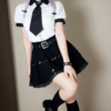 Black and beige plaid mini skirt with asymmetrical layered design, featuring a knot at the waist. The checkered pattern is a mix of black, beige, and gray, creating a textured look. The skirt has a flowing draping effect and slightly uneven edges. The skirt is mid-thigh length, slightly angled, and in the image is positioned vertically. Off-white ribbed knit socks, casual, trendy, and modern.