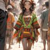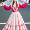 red and black plaid strapless dress (Outfit Description: 1.2), pleated mini skirt (Outfit Description: 1.2), (Accessories: 1.1), belt with heart-shaped studs. (Accessory: 1.1), layered necklace and bracelet. Pleated miniskirt, black belt, silver heart-shaped detail. (Detailed Outfit: 1.2). Black platform knee-high boots (detail outfit: 1.2, accessory: 1.1),