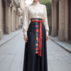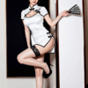 wearing a light blue denim-style two-piece outfit. The top is a cropped button-up jacket with large bow detail and lace-up design, while the bottom is a ruffled layered miniskirt with a slightly asymmetrical hemline. Both feature pastel pink details and lace-up trim. She wears transparent white high socks and white platform shoes with a large bow. A pastel pink handbag with a heart design is visible.
