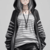 wearing a dress decorated with bright strawberries. The dress is black with colorful prints of strawberries, The dress is a puffy A-line style with ruffles at the hem and a red ribbon-style waist tie.