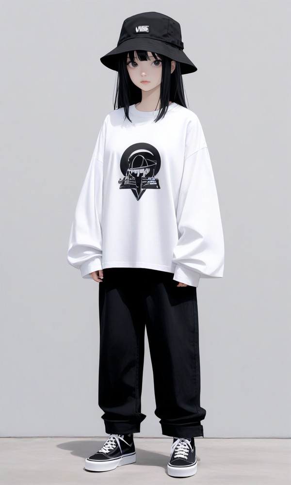 wearing a white, loose-fitting, long-sleeved T-shirt, black wide jeans, and black Vans sneakers. On his head he wears a black bucket hat.