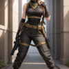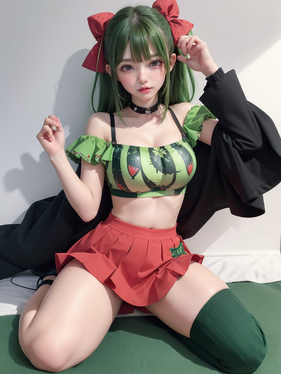 wearing ruffled watermelon print crop top with green and black stripes, crop top is off shoulder, watermelon print short sleeves, watermelon red skirt with green ruffled, two green lines at hem, each chest has a watermelon design, watermelon designed head ribbon, thick-soled high heels with black wired fastenings.