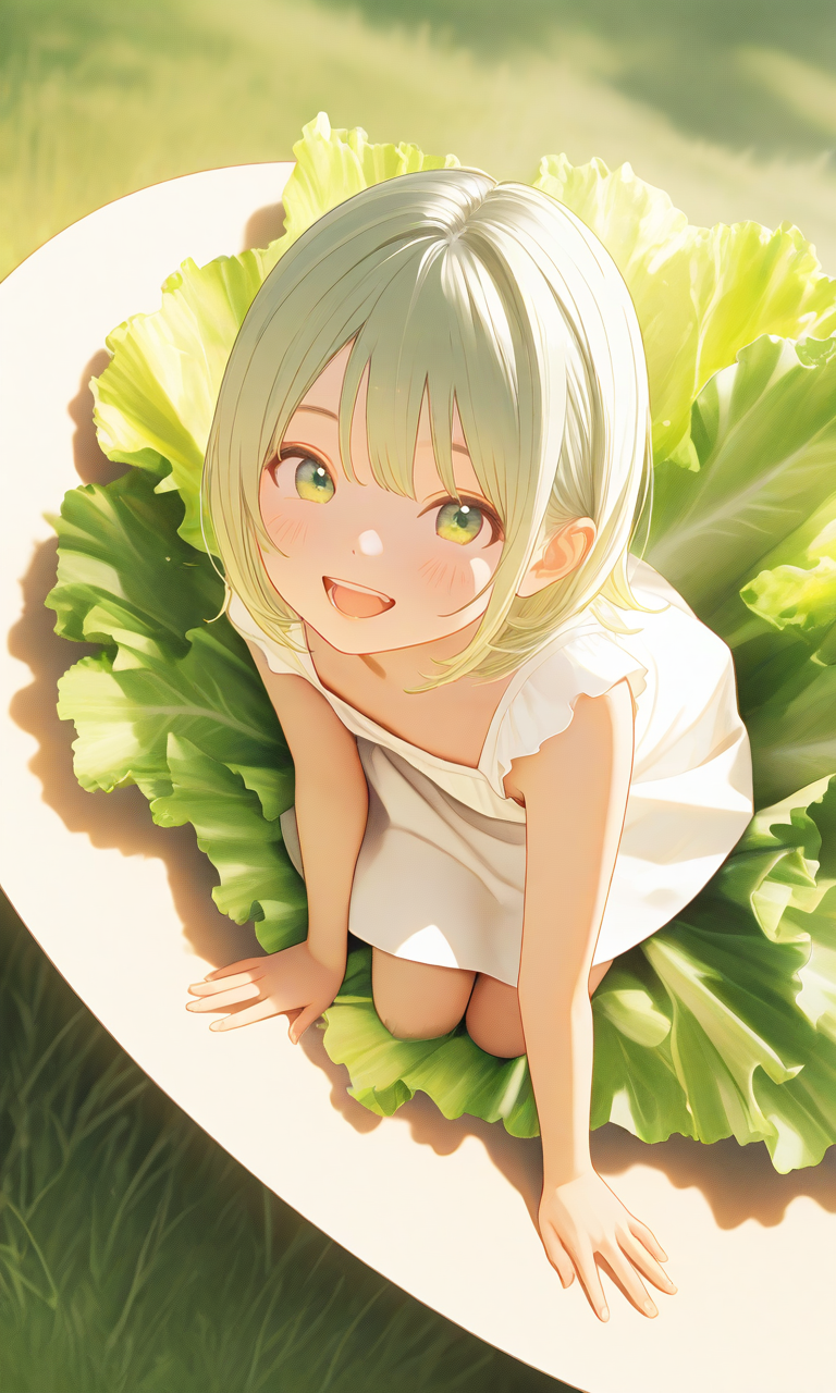 A girl, chibi, sits atop the golden-brown bread, beaming with a full smile.