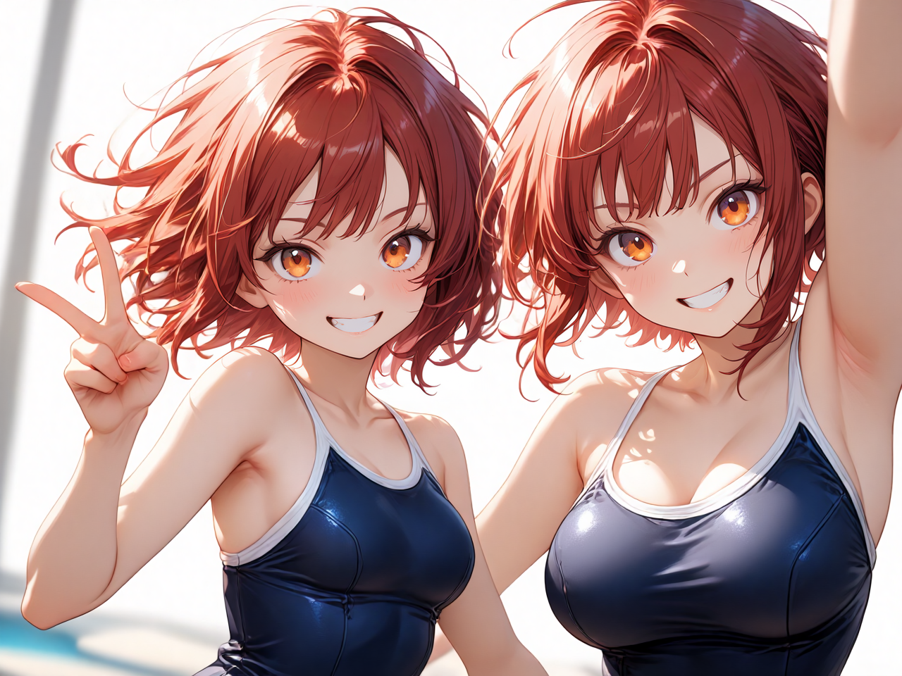 in winter pool, 1girl, wearing school swimsuit, making a victory gesture with one hand, with a rather ample bust and a slim, petite figure. Slim limbs, a mischievous smile, short hair, anime-style illustration.