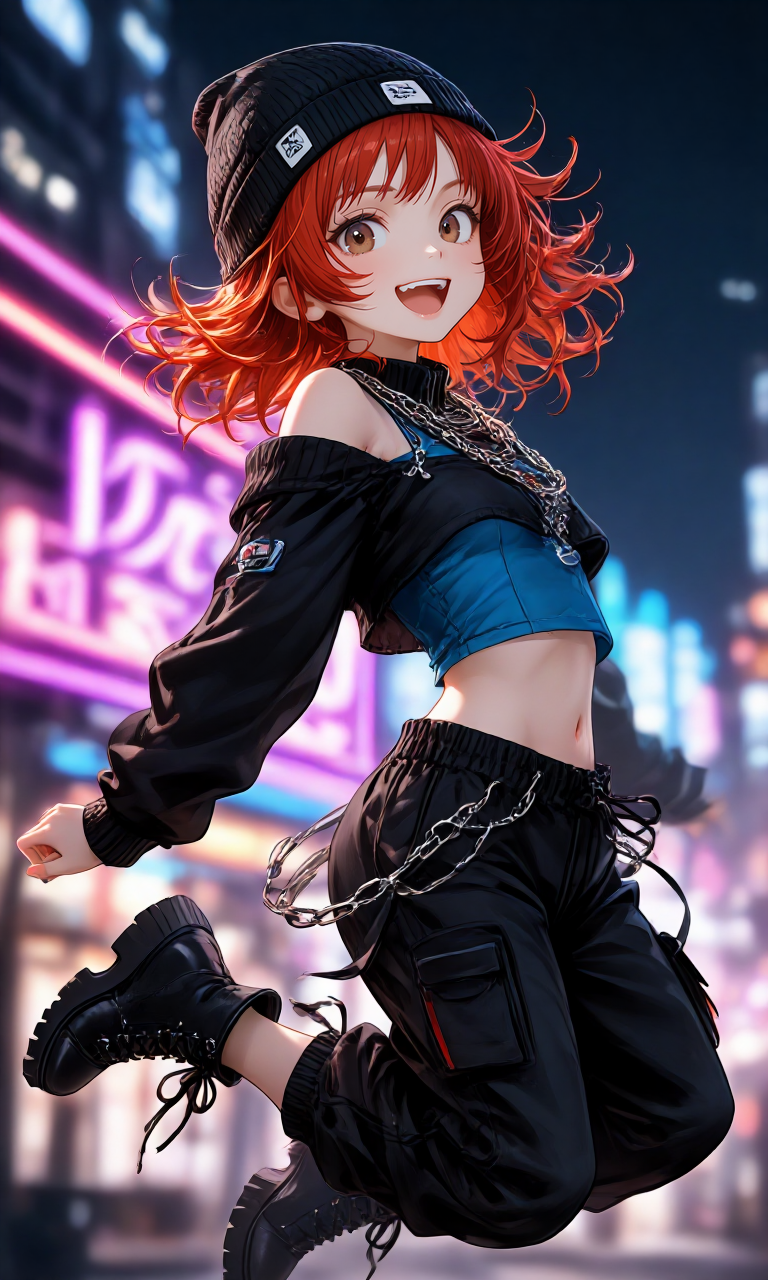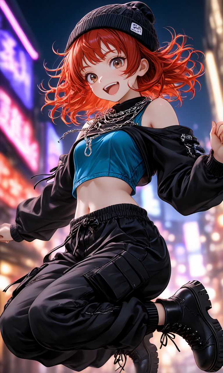 ファッション系のサイト見てて、ヒップホップのセットアップを見てプロンプト化したんですけど、「あーもちょっと派手にしたい」と思ってあれ増やしたりこれ増やしたりと試行錯誤した衣装です。