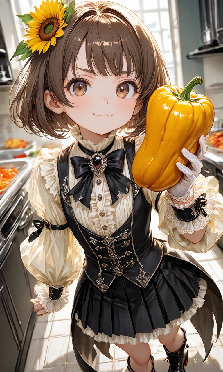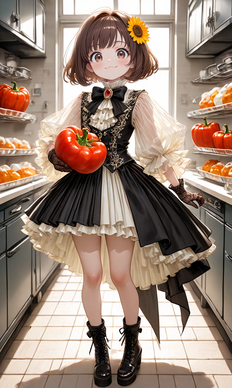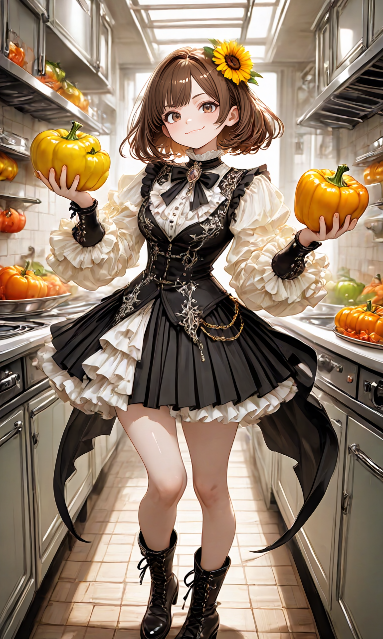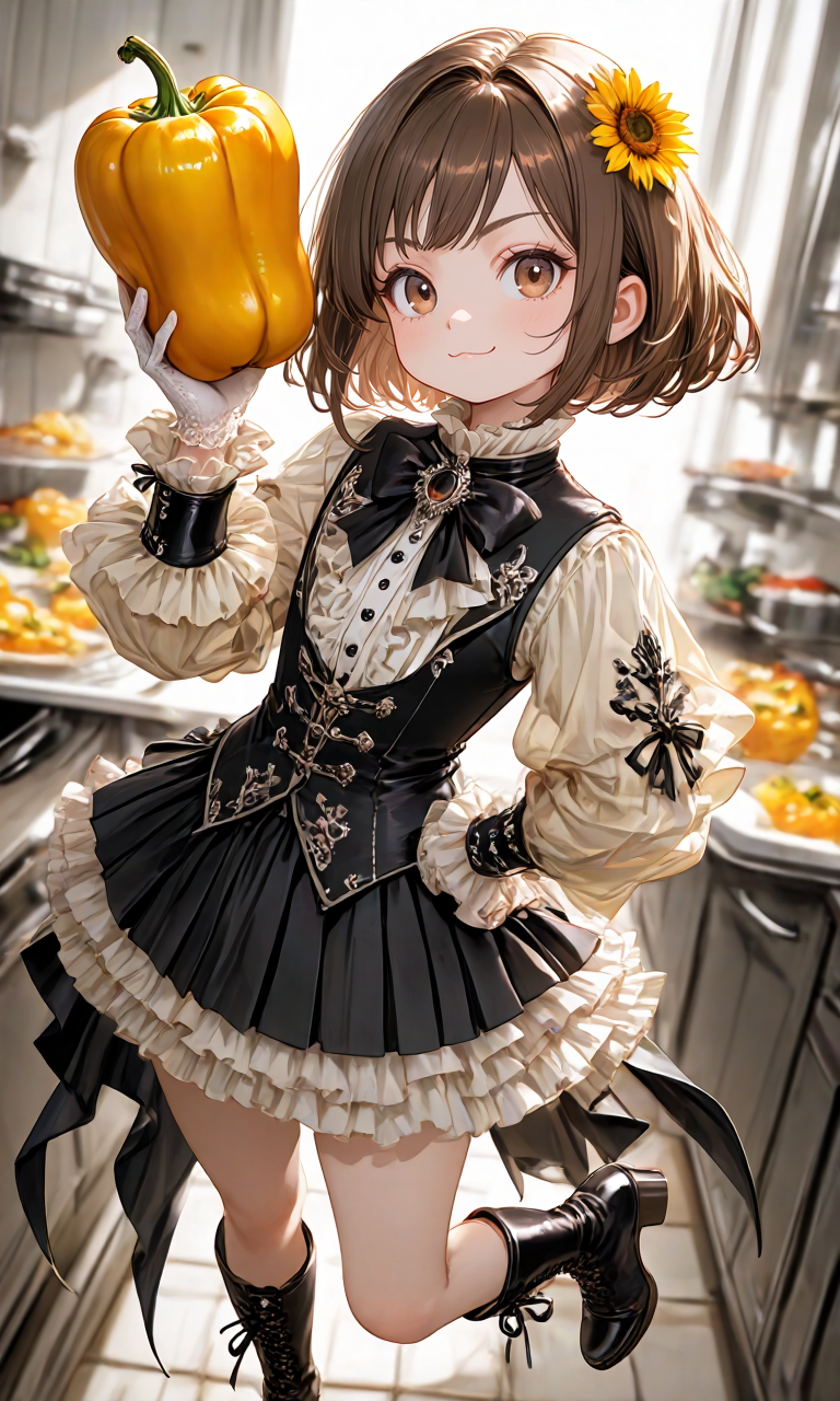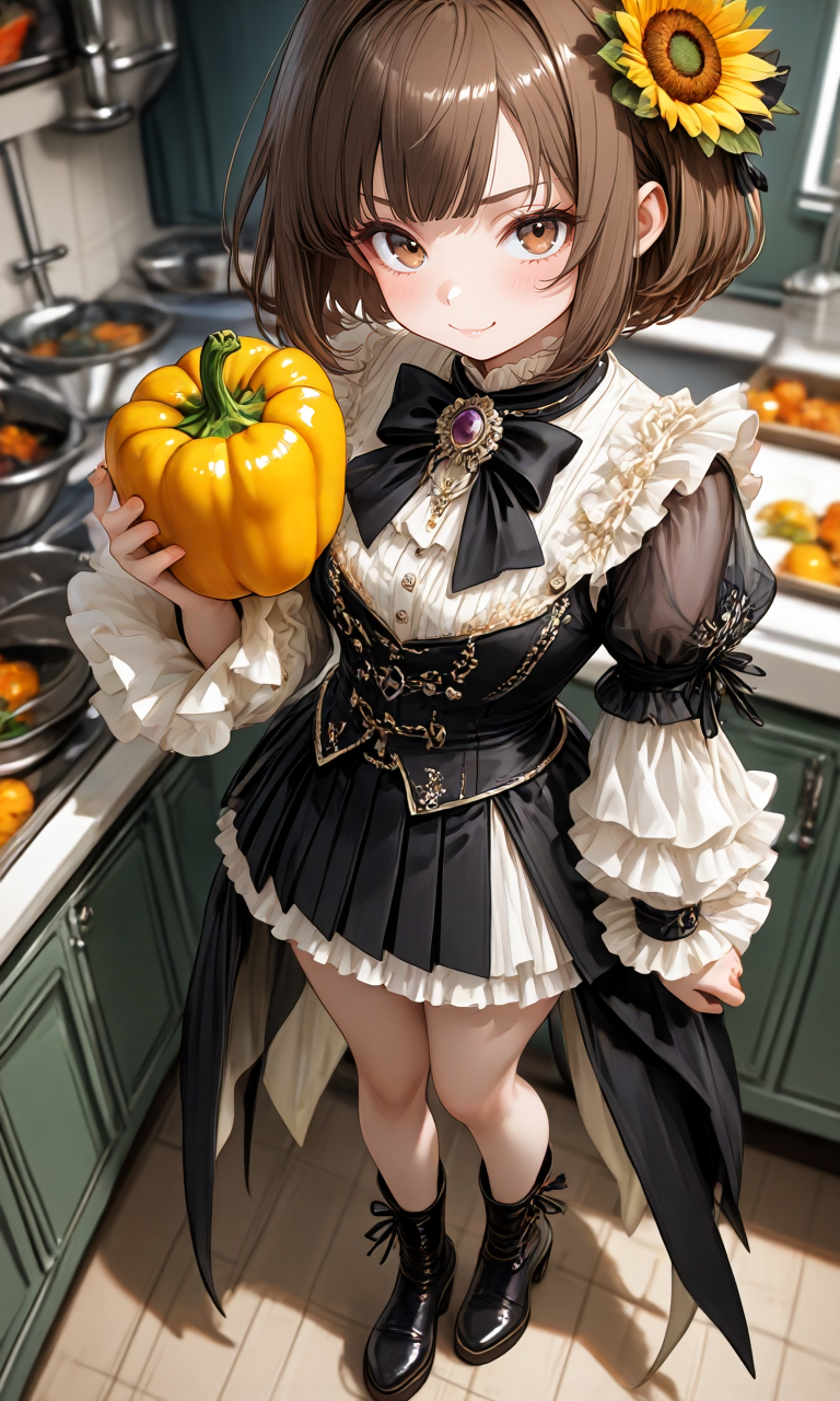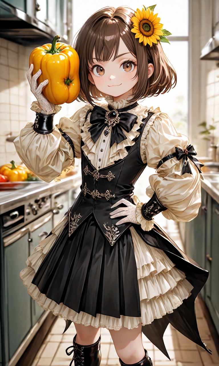 Girl, bob cut, brown hair, brown eyes, round eyes, ((wearing a sunflower accessory on head)), holding a large yellow bell pepper, smug expression. Standing perfectly still. flat chests,