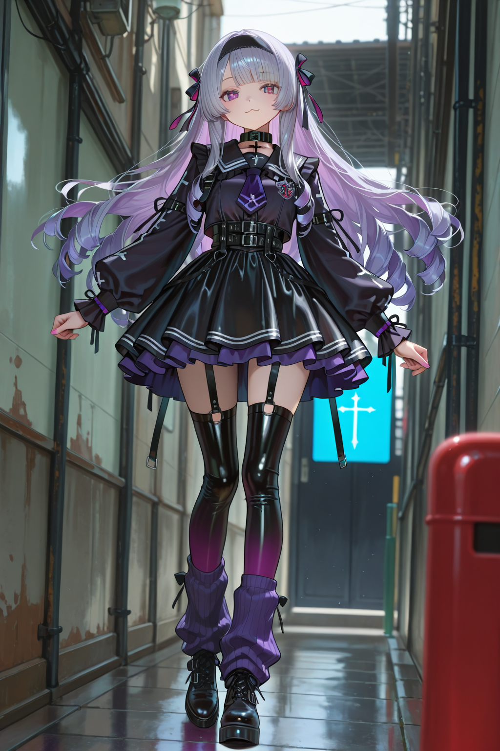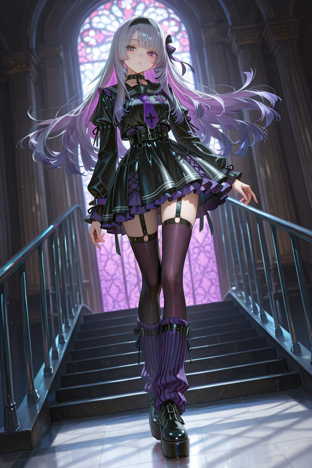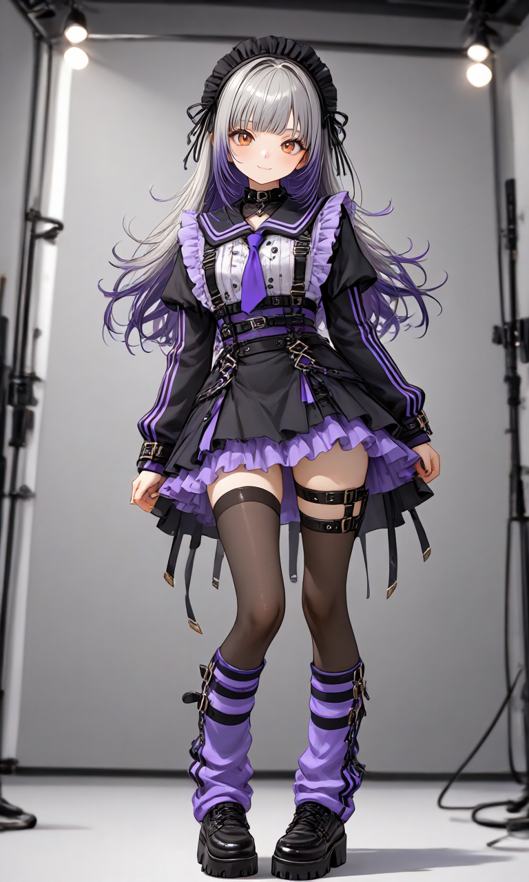 techwear gothic idol outfit, black and lavender color scheme,