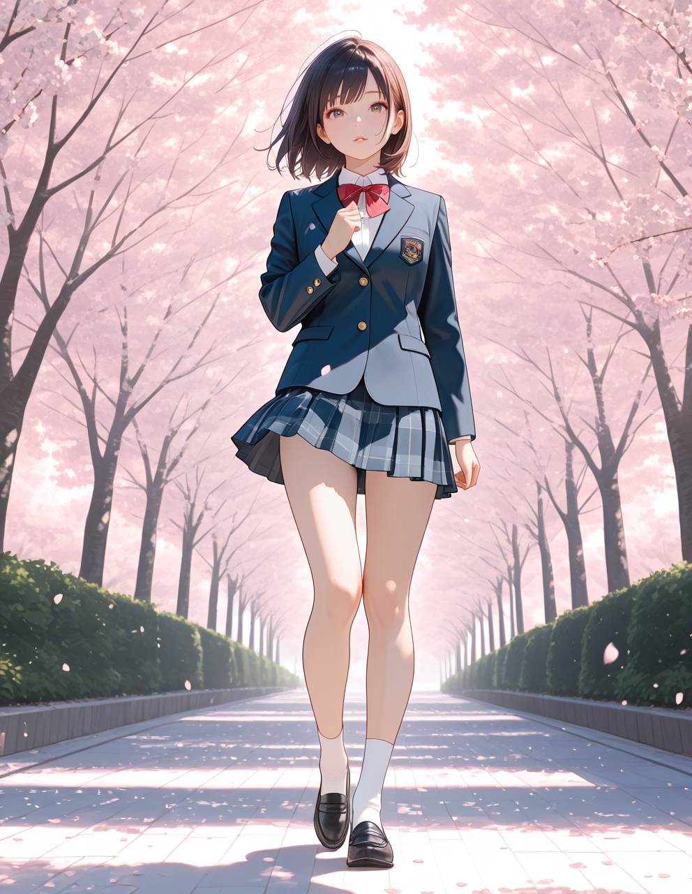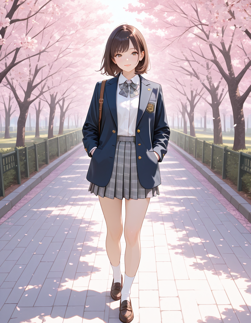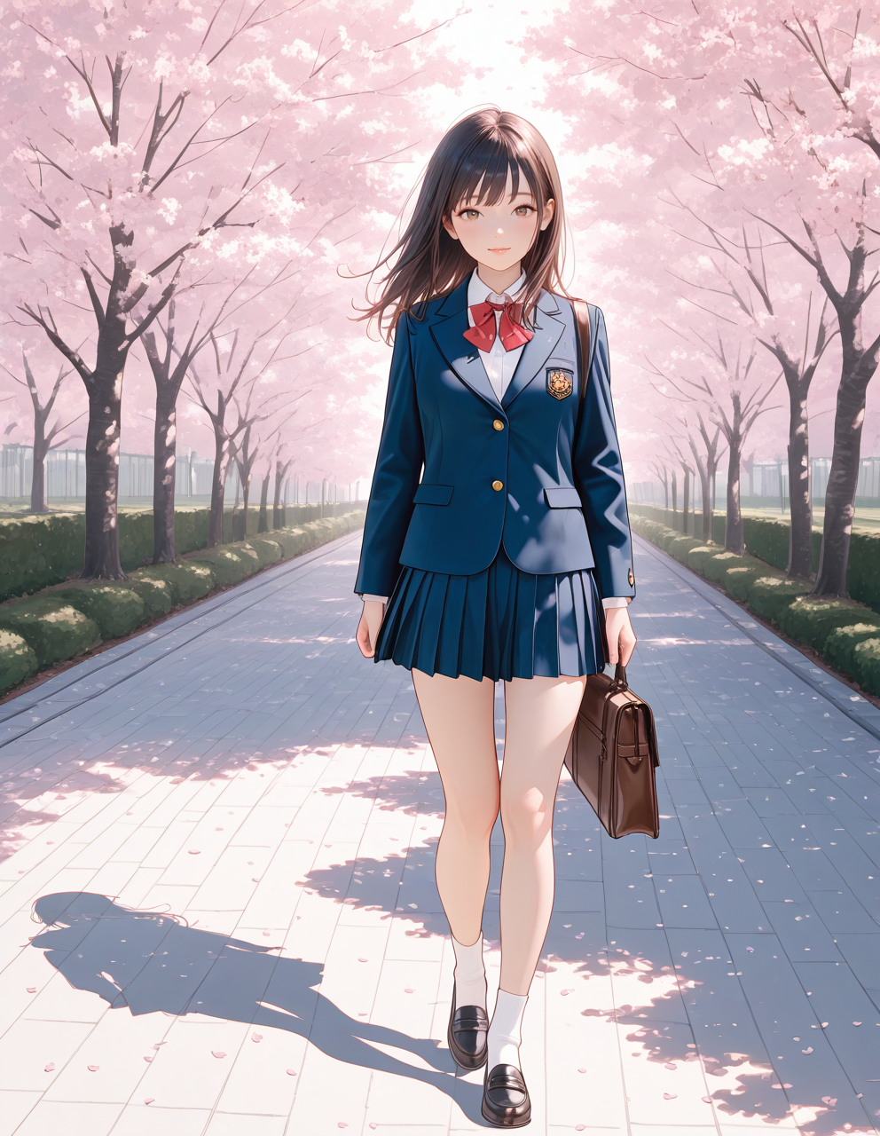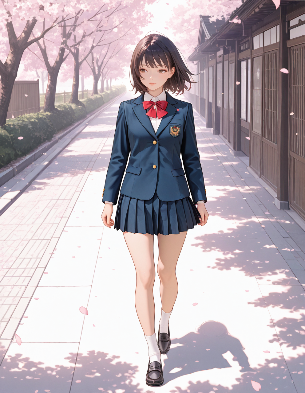 wears her school leather shoes, white socks, and navy school blazer.
