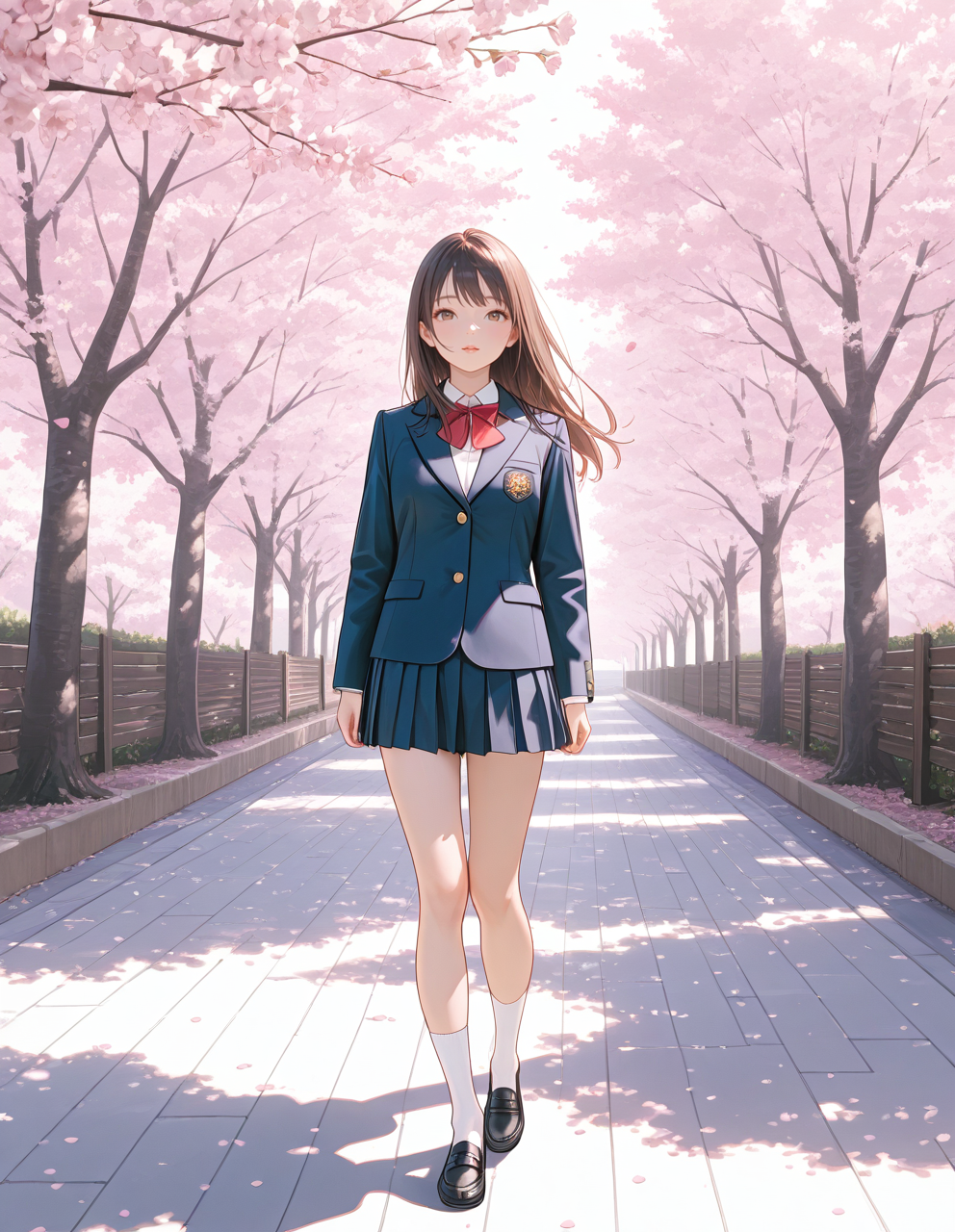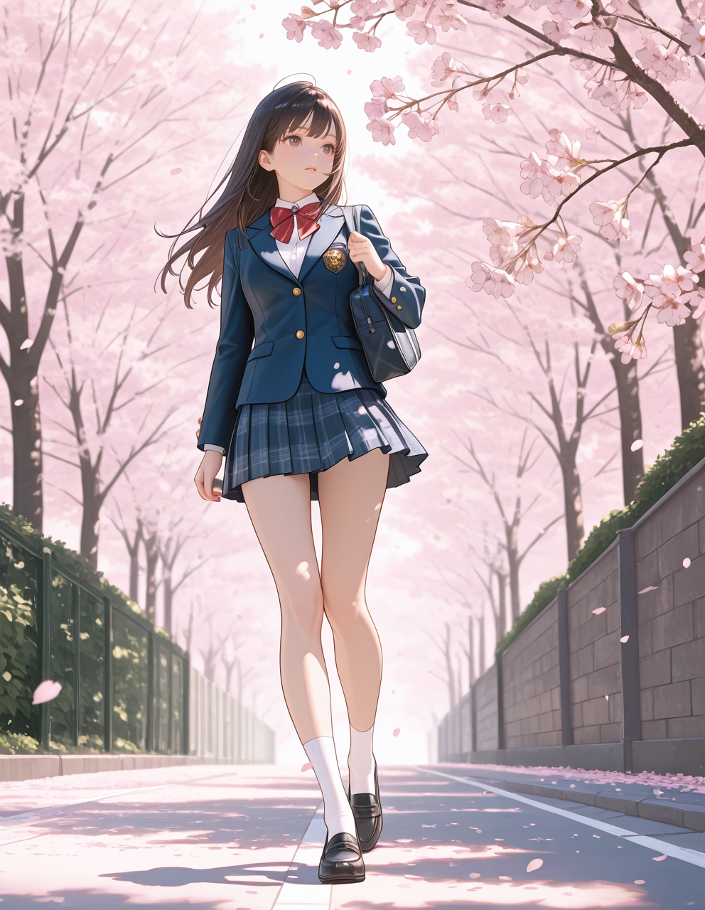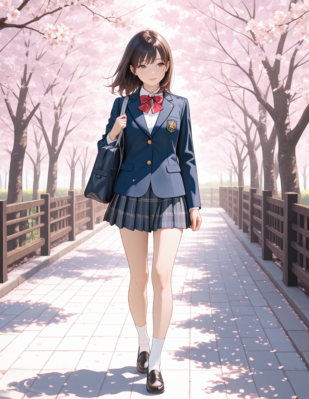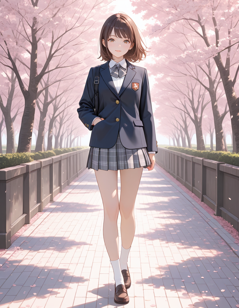 wears her school leather shoes, white socks, and navy school blazer.