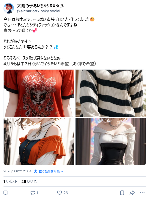 日曜日に衣装プロンプトをい~っぱい作りました。