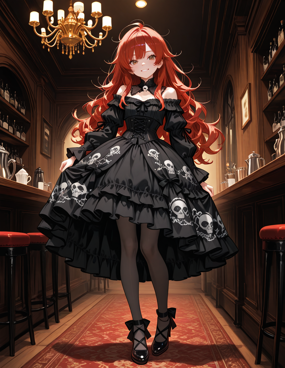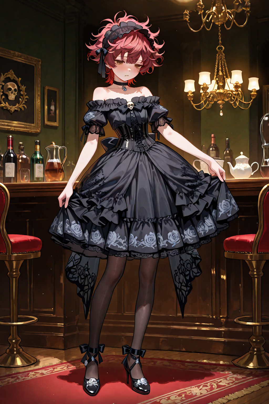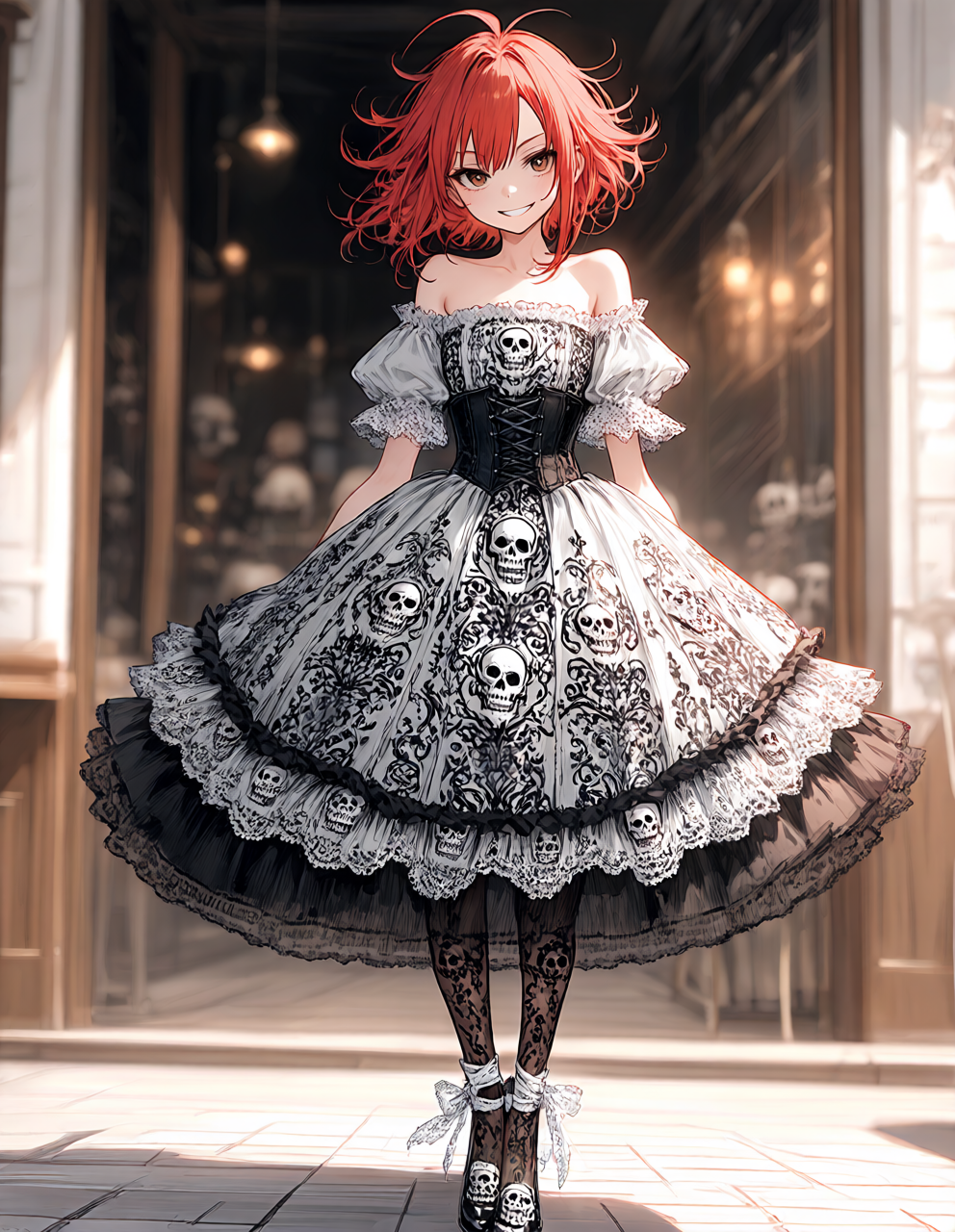 モトはノースリーブのオフショルドレスで、全面に髑髏のデザインとこーなんてゆーんだ?