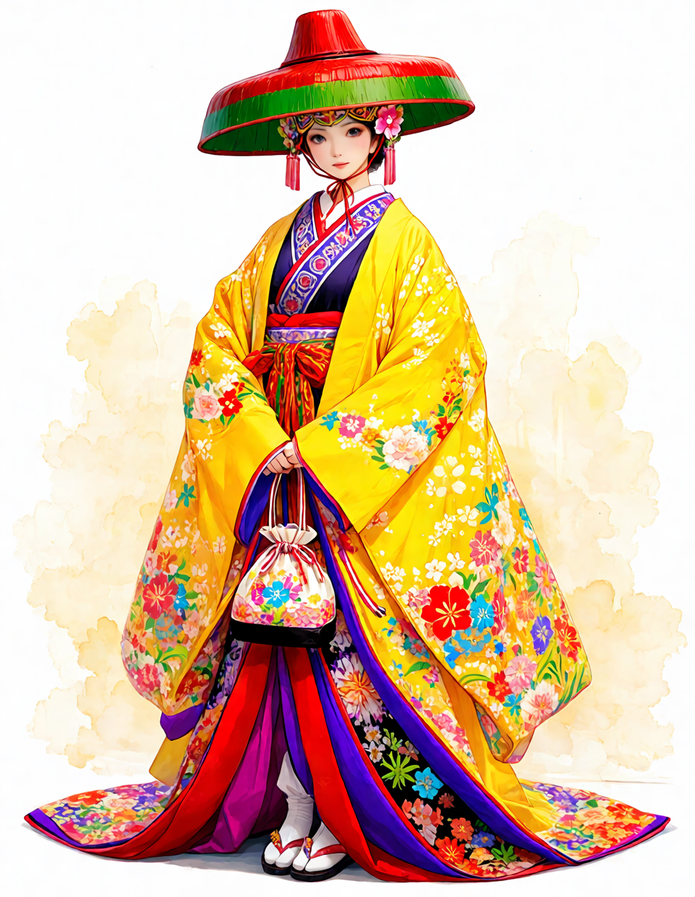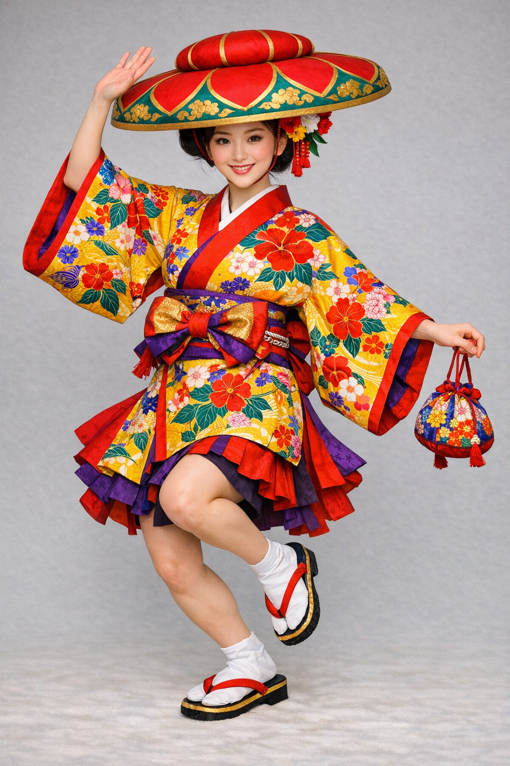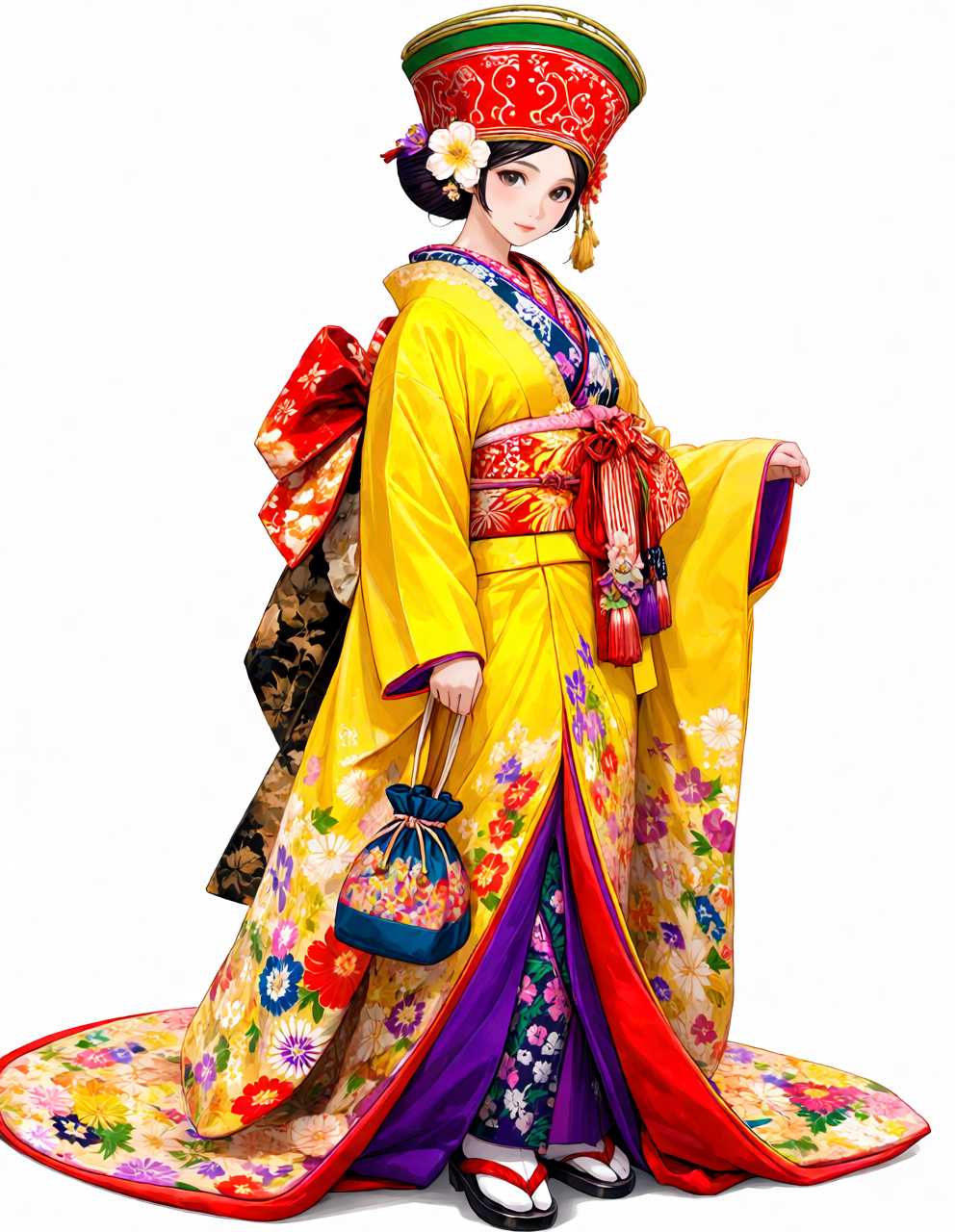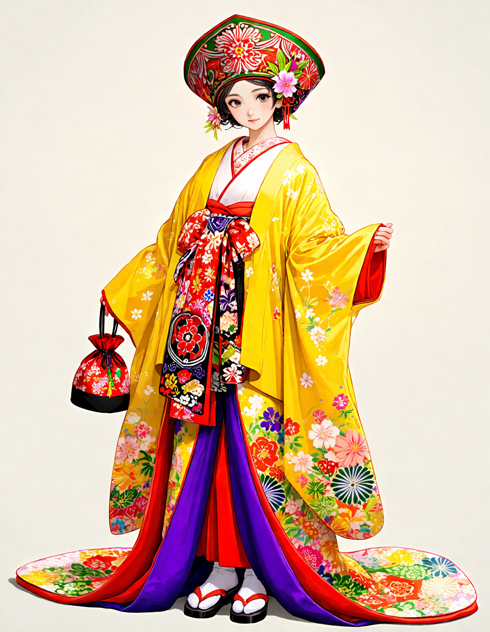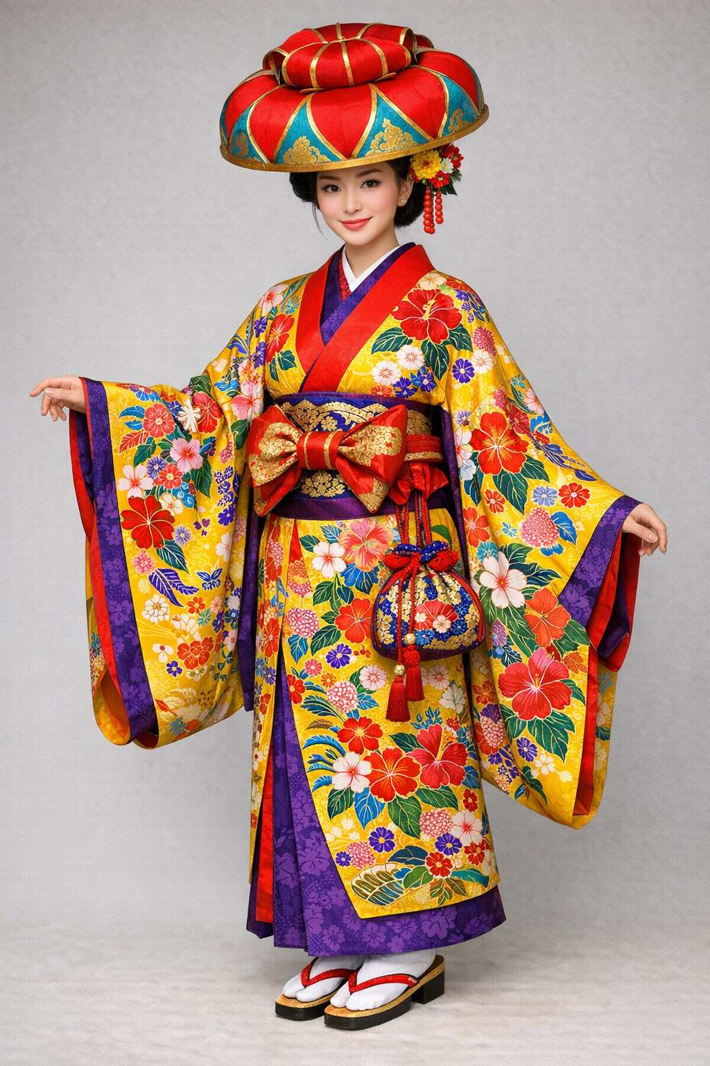 traditional Ryukyu eisa costume, Okinawan dance outfit, bingata style fabric, bright yellow with colorful floral patterns,
