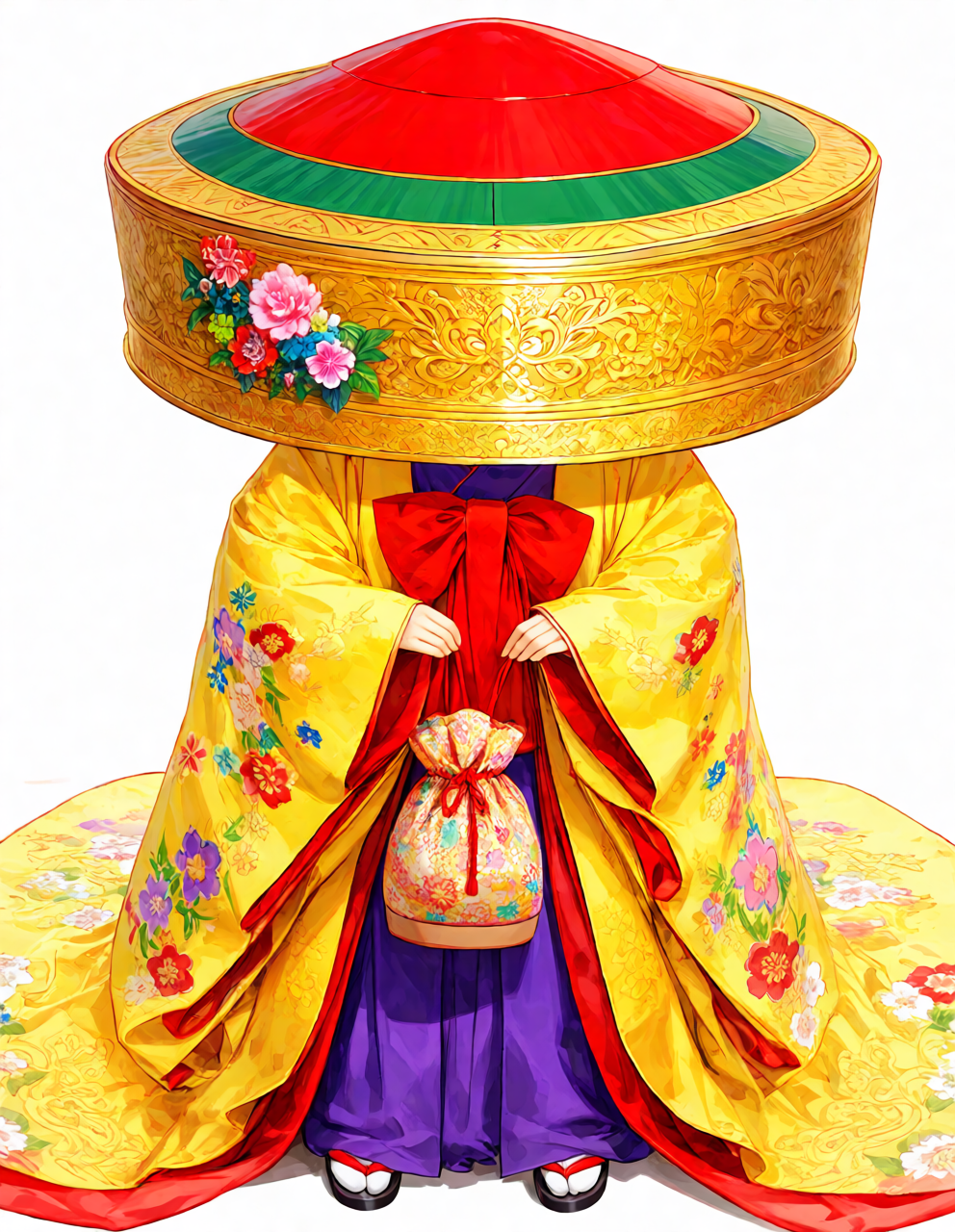 large ornamental Ryukyu dance headdress, oversized circular flat hat, wide flat brim, rigid structure, red top dome, green band with gold patterns, floral decoration,