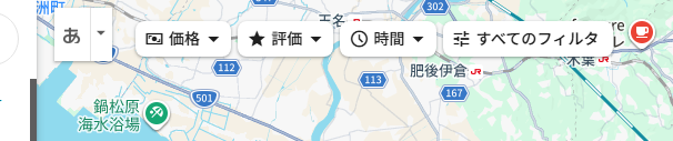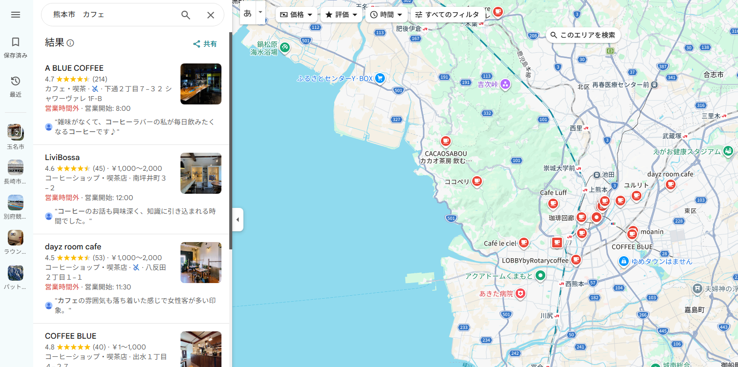 たとえばこれまでだと「熊本のカフェ」とか検索すると、だだだだだっ‼ってこんな風にピンが出て来て、い・・いやこの中のどれがいいんぢゃ?💦となってました。