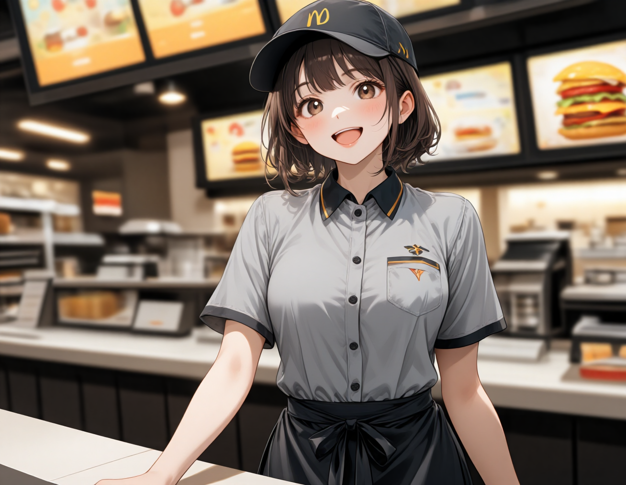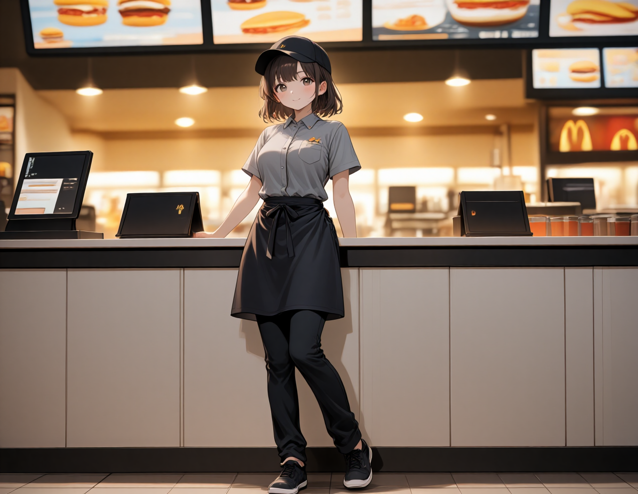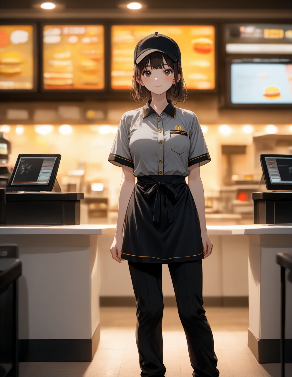 fast food restaurant staff uniform, realistic detail, workers standing, full body,