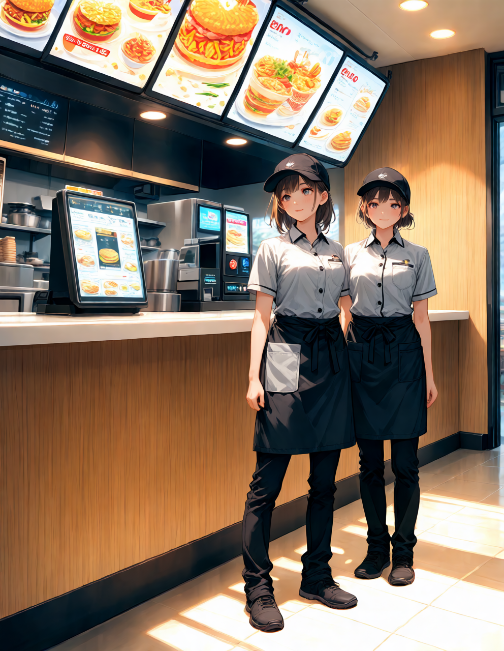 fast food restaurant staff uniform, realistic detail, two workers standing, full body,