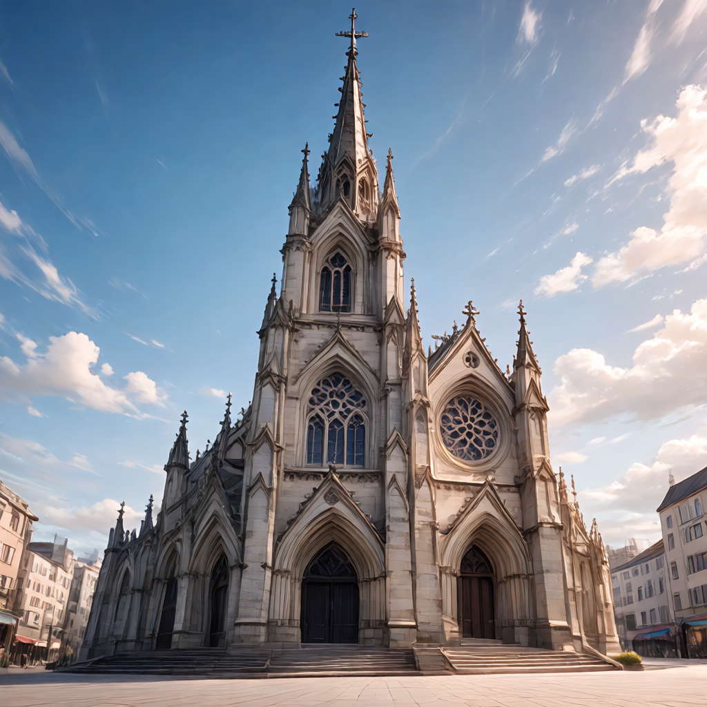 New Zealand, frontal view of gothic cathedral with tall central spire,