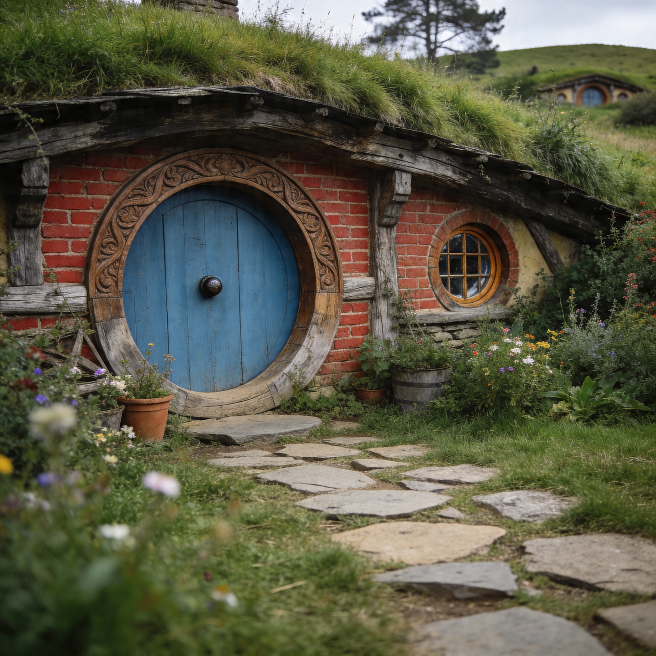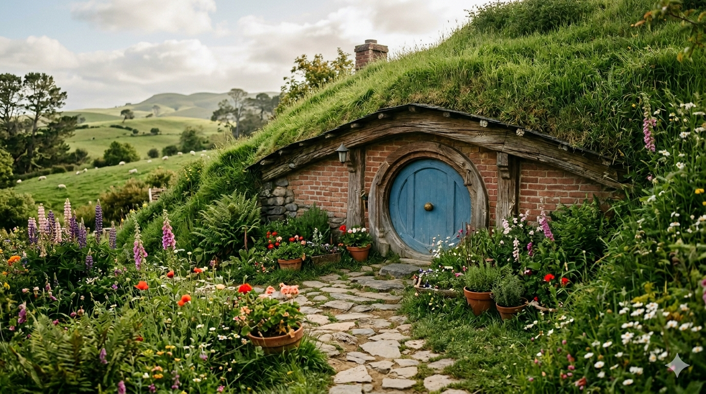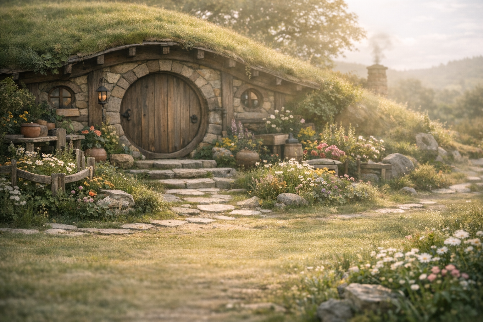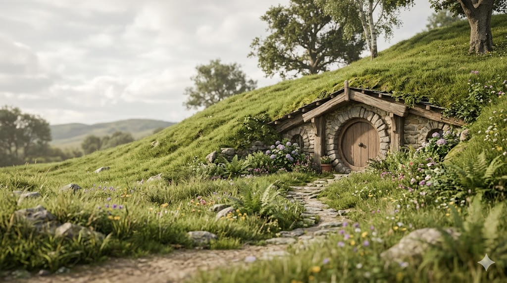 hobbit hole built into a grassy hillside, 冒頭のここですね。