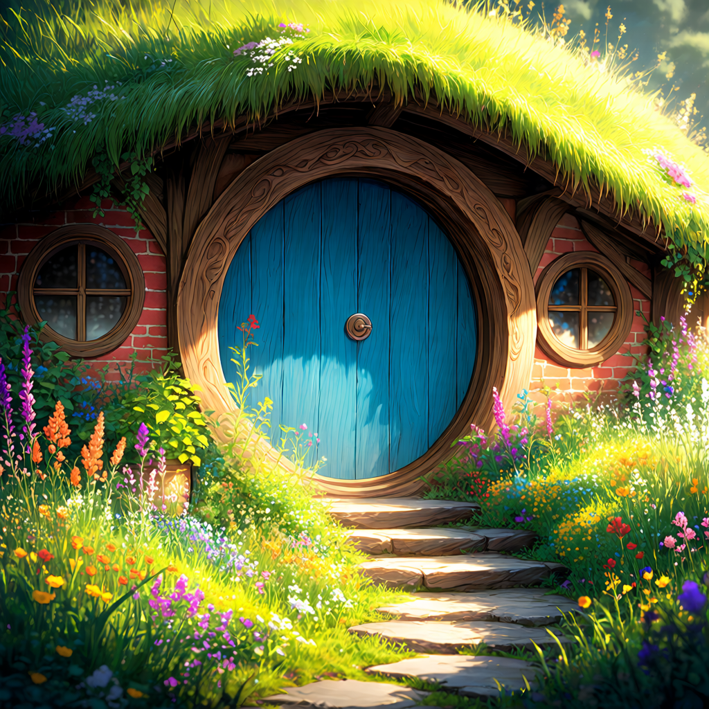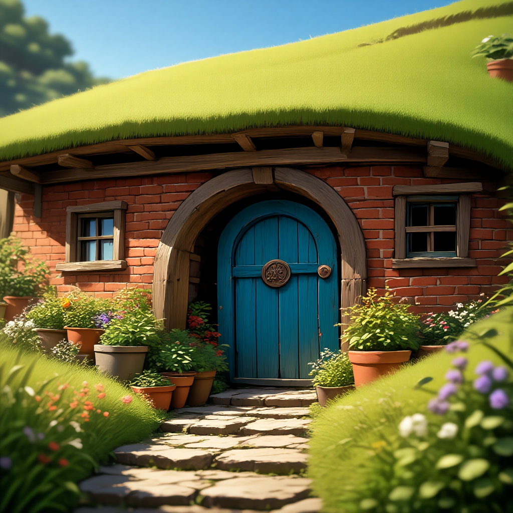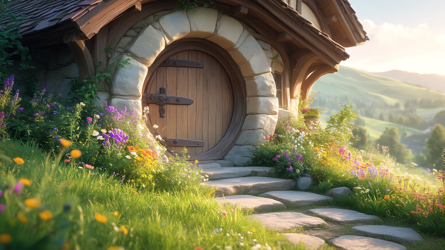 hobbit hole built into a grassy hillside, 冒頭のここですね。