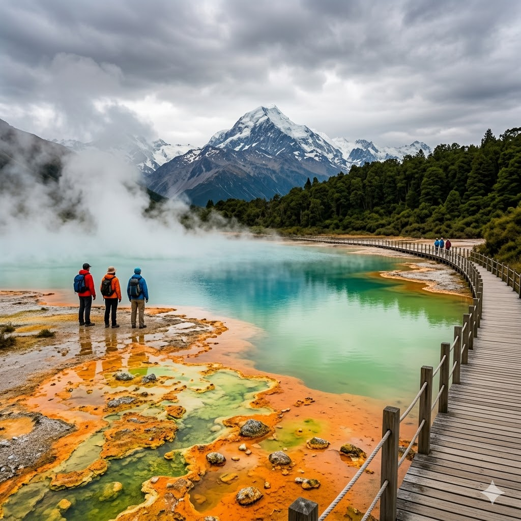 midground left: bright turquoise geothermal pool,