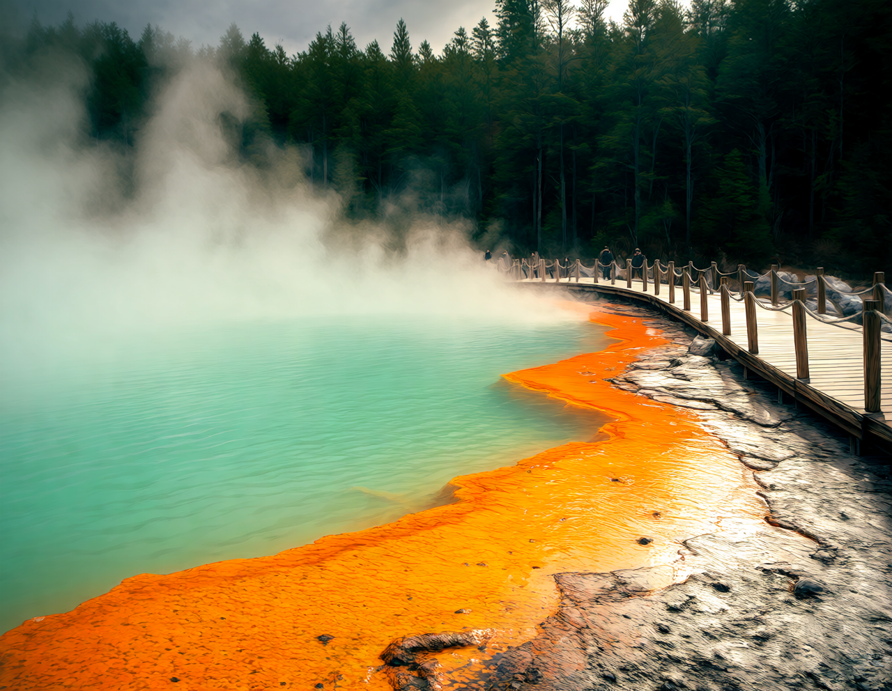 strong color contrast: orange mineral deposits vs turquoise water vs dark green forest,