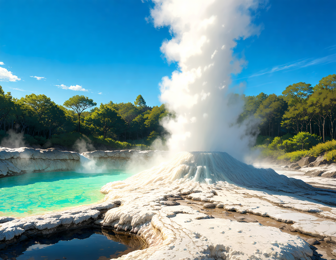 slightly low eye-level perspective looking up toward the geyser,
