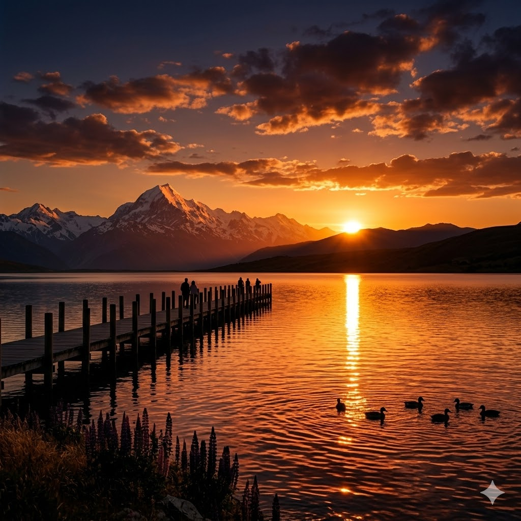 sunset over a calm lake in Rotorua, New Zealand,