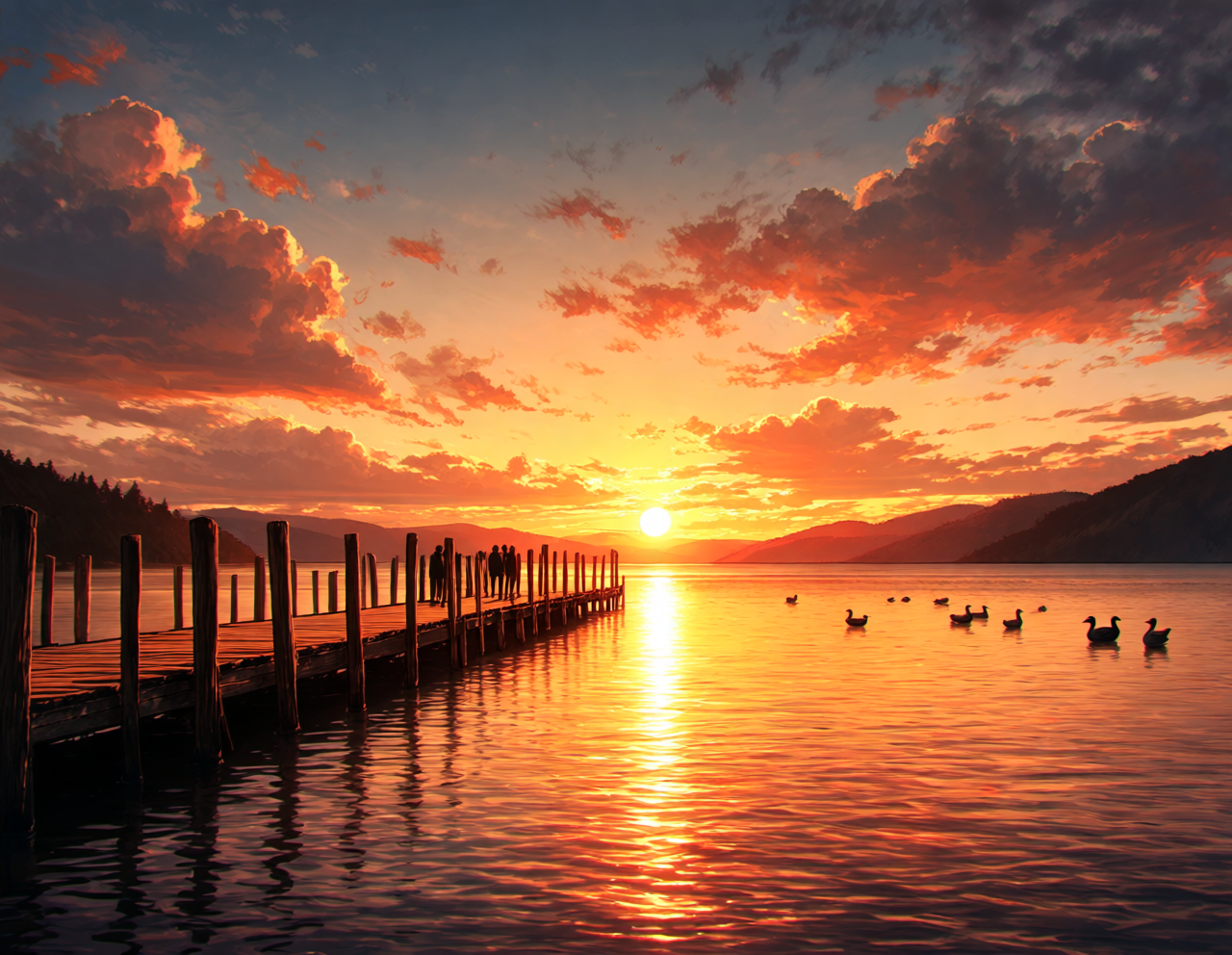 midground right: several ducks floating on the water, small dark silhouettes,