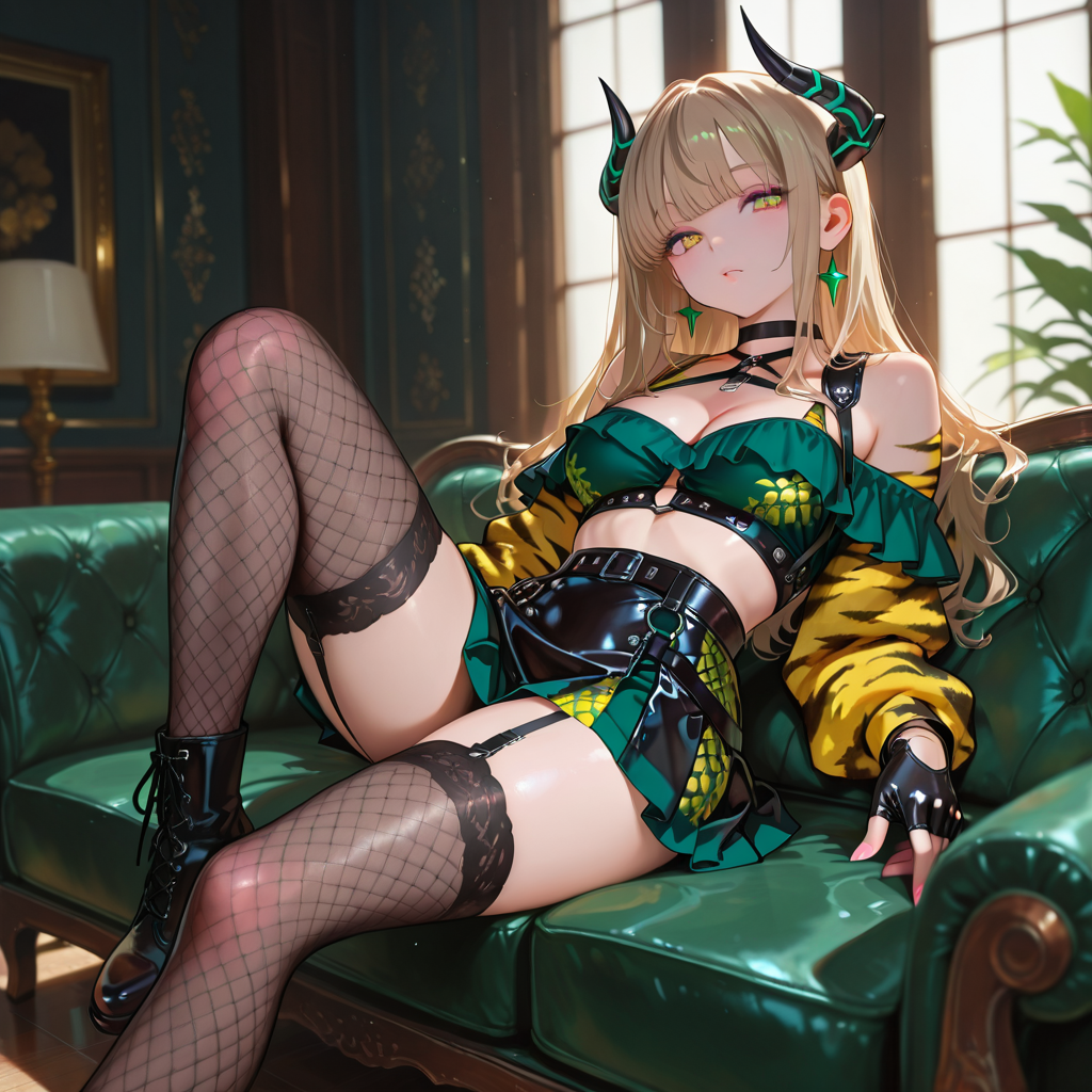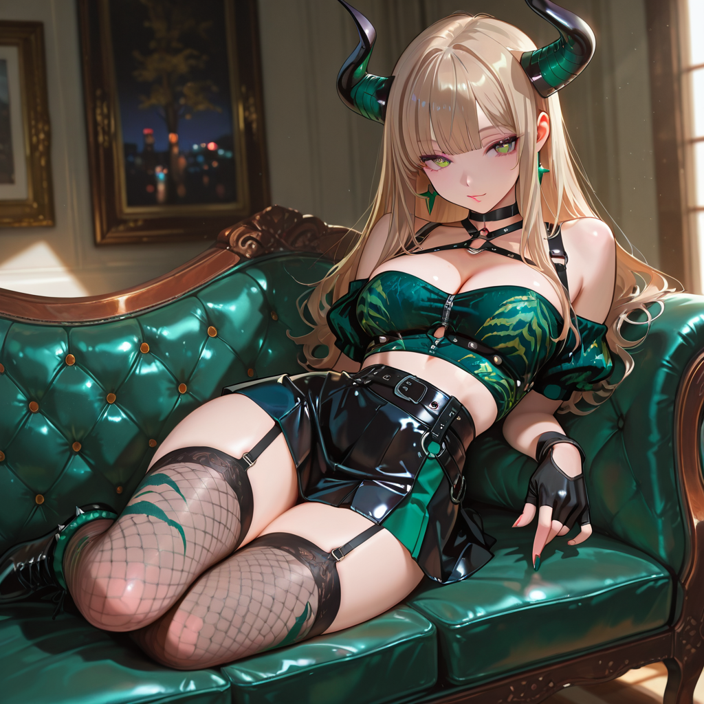 今日のAICFASの投稿でも書きましたけど、環境プロンプトの modern interior background, green velvet sofa, soft lighting, がバリッバリに効きすぎてやっぱ緑主体になった感じですけど。