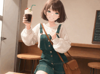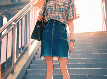 wearing a cream-colored, lacy, knitted sweater (detailed clothing:1.2) with long bell sleeves, (detailed pattern:1.2), with a v-neckline. She is wearing a dark olive-green mini skirt (detailed clothing:1.2), (body type:1.1), wearing a brown leather satche ...