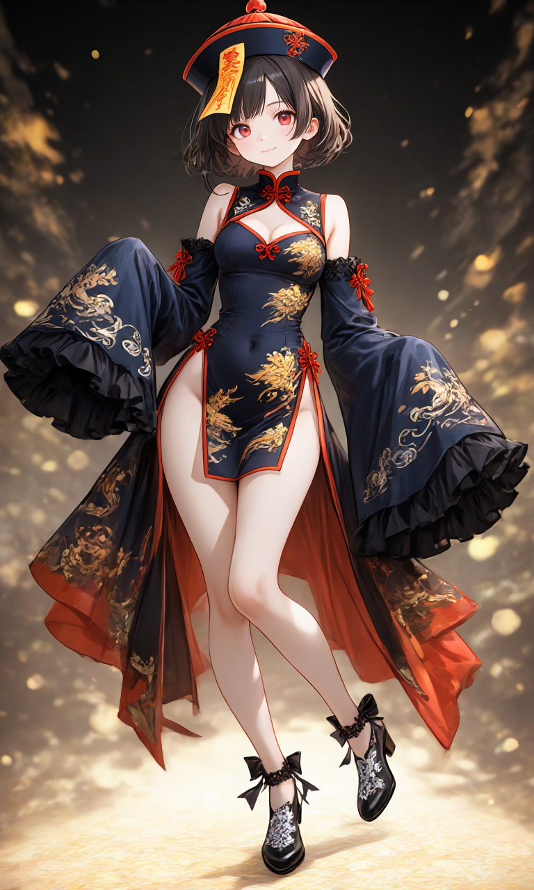 コスプレ風の衣装です。最初はかわいい系のチャイナと思ったんですけど、そんなんプロンプトがカンタン過ぎてお話にならないし、インパクトもない😊とゆーことでセクシー系に移行したんですけど「なんか足りないぞ・・・」となり、結局セクシー+キョンシーのシーシーコンビに。 Chinese-inspired fantasy outfit, anime style, dark navy and black color scheme with red trim accents, high-cut slee ...