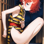 『必殺仕事人IV』の主題歌「花の涙」から着想を得た衣装です。 縁日で買ったおもちゃの面、化粧をしてない心の顔に~~🎵歌詞にぞわぞわするので😊 これ、もともとが背中に鳥居のデザインとゆーのがポイントではあるので背中を中心に書いてるんですけど、前向いててもまーそれなりに。もし強調したいのであれば、from side とか from behind で調整していただければ。 kitsune mask outfit, full body, woman wearing costume, ...