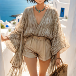 なんとなくギリシャとかで女ひとり旅をしてるおねいさんのイメージを作りたくて、それに合わせたコーデです。国内で着るなら今の時期とかは最適と思うですよん🎵 短いやつはわたしのいつもの長いプロンプトを、ちゃぴーがアレンジしてくれました。にしてもわたしに「kimono wide sleeves」の発想はなかった😅 linen poncho top, loose oversized silhouette, v-neck, wide neckline, kimono wide slee ...
