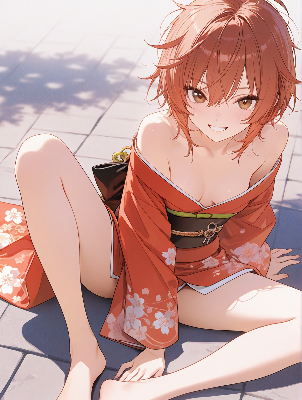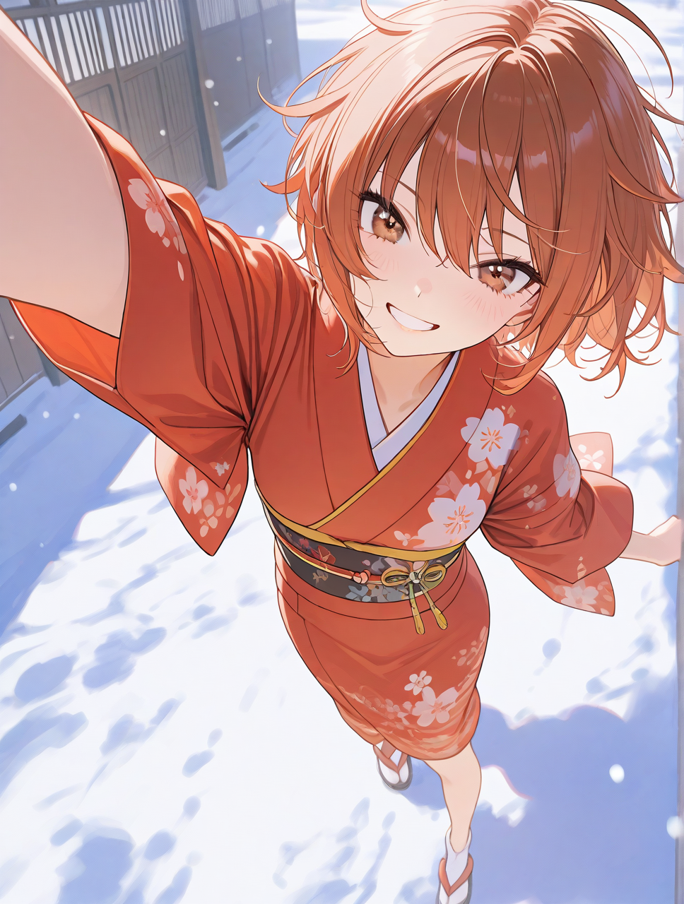椿の花を柄にした巫女服のよーな大正衣装をイメージした和装です。 wearing modern hakama-style outfit, cream-colored kimono top with large red camellia floral patterns, traditional Japanese floral print, soft fabric texture, wide kimono sleeves, loose and flowing, deep red hakama-style s ...